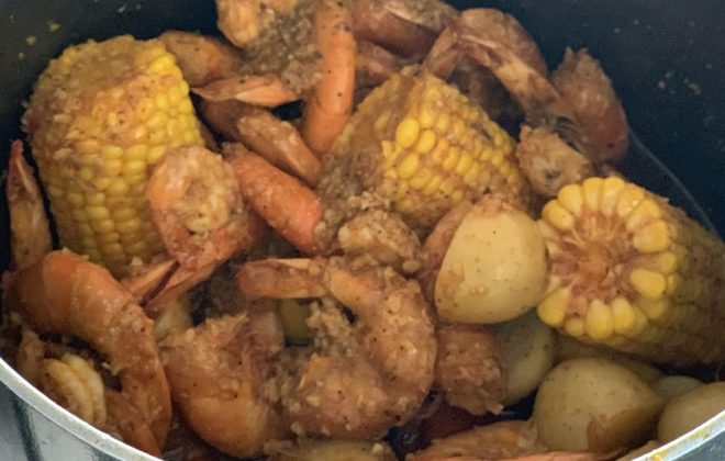 Poner a cocer las papas y los elotes en agua. Al mismo tiempo poner otra olla agua y un limón para poder cocer los camarones de tres a cinco minutos, hasta que este de color rosa y blanco. En una olla grande poner a derretir las cuatro barras de mantequilla a fuego lento, ahí agregar los ajos picados muy finamente, seguir moviendo lentamente para que no se quemen los ajos ni la mantequilla ahora agregar los sazonadores y picante al gusto y seguir moviendo, a fuego lento. Ahora exprimir un limón amarillo y agregar a la mantequilla para que de mas sabor. Escurrir los camarones, papa y elote y agregar a la salsa, dejar reposar unos minutos y servir.