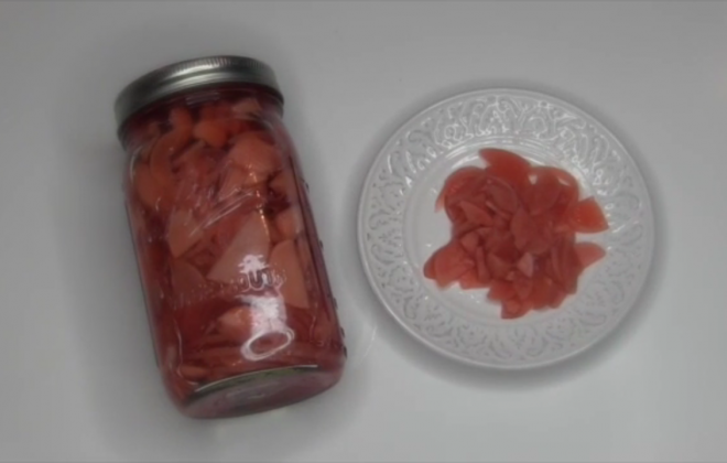 Poner en un bote de cristal los rábanos pelados y con la ayuda de un embudo, añadir la mezcla.
