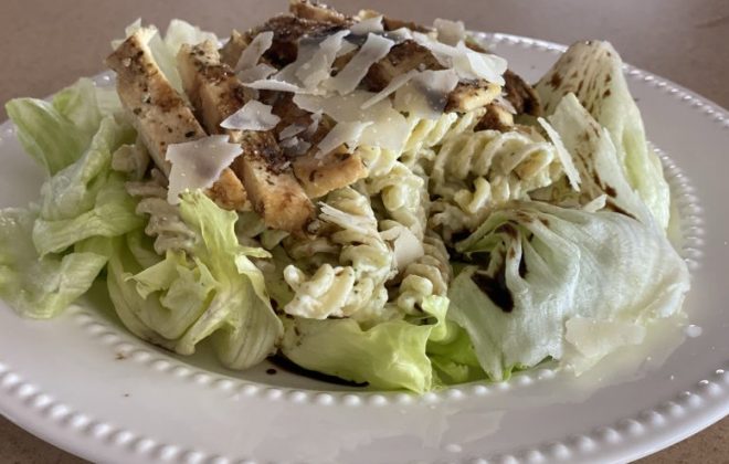 Pones una cama de lechuga, una capa de pasta y media pechuga encima, adereza con vinagre balsámico y parmesano y listo a disfrutar.